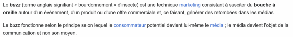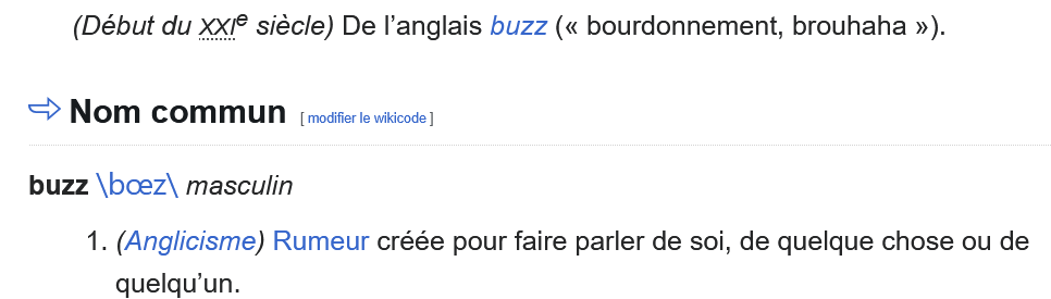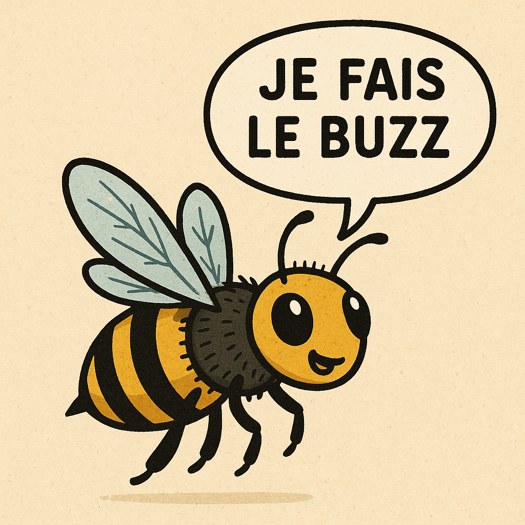 L’anglais « buzz » signifie « bourdonnement », par extension « brouhaha », « rumeur », etc.