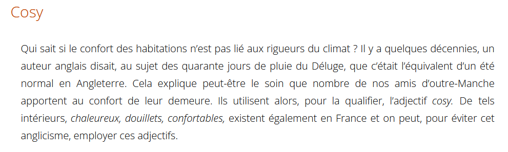 « Cosy » vient du gaélique écossais colsie, mais la dérivation ultime est inconnue. Peut-être d’origine germanique, comme le norvégien kose seg (« passer un moment agréable »), du vieux norrois kose sig, de koselig, koslig, peut-être en fin de compte du vieux haut allemand kōsa ; voir l’allemand moderne kosen (« faire un câlin »). Wiktionnaire