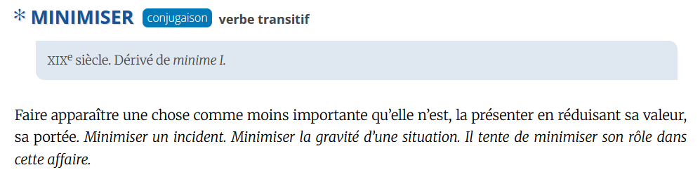 « Minimiser » signifie « dissimuler l’ampleur », « réduire l’importance », « camoufler la gravité », etc.