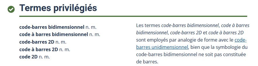 « Le terme QR Code est une marque de commerce déposée qui désigne un format de code-barres bidimensionnel, notamment caractérisé par le motif de positionnement qu’il comporte dans trois de ses coins. Ce format libre d’utilisation a été adopté par les normes internationales depuis l’an 2000. Il existe d’autres types de codes-barres bidimensionnels, comme le Flashcode, notamment utilisé en France. »