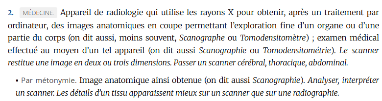 un numériseur, un lecteur, un radiomètre, un scanographe, un tomodensitomètre (ou numériser, lire, contrôler, parcourir, chercher, etc.) (ou une numérisation, une lecture, un contrôle, une scanographie)