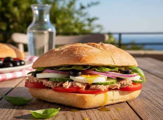 C’est un sandwich à base de pain long ou rond, et d’ingrédients similaires à la salade niçoise (anchois, crudités, olives niçoises, huile d’olive, vinaigre de vin).
