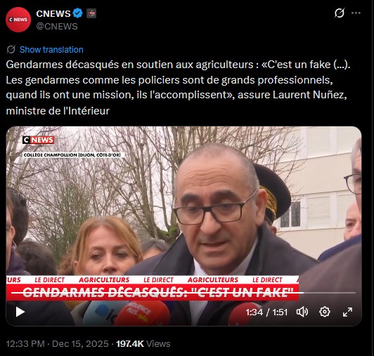 Après Amélie de Montchalin (ministre de l’Action et des Comptes publics) qui parle de « deals » et François Bayrou (ex-Premier ministre) qui parle de « boomers », voici Laurent Nuñez qui, s’adressant à des journalistes francophones, pour être relayé sur des chaînes de télévision francophones, dit : « c’est un fake« .