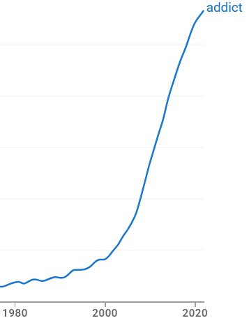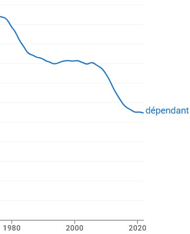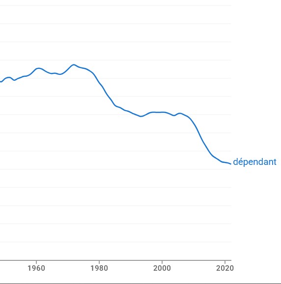 On voit bien sur ces graphiques l’essor très récent d' »addict » et d' »accro » dans notre langue, aux dépens de leur équivalent français « dépendant »